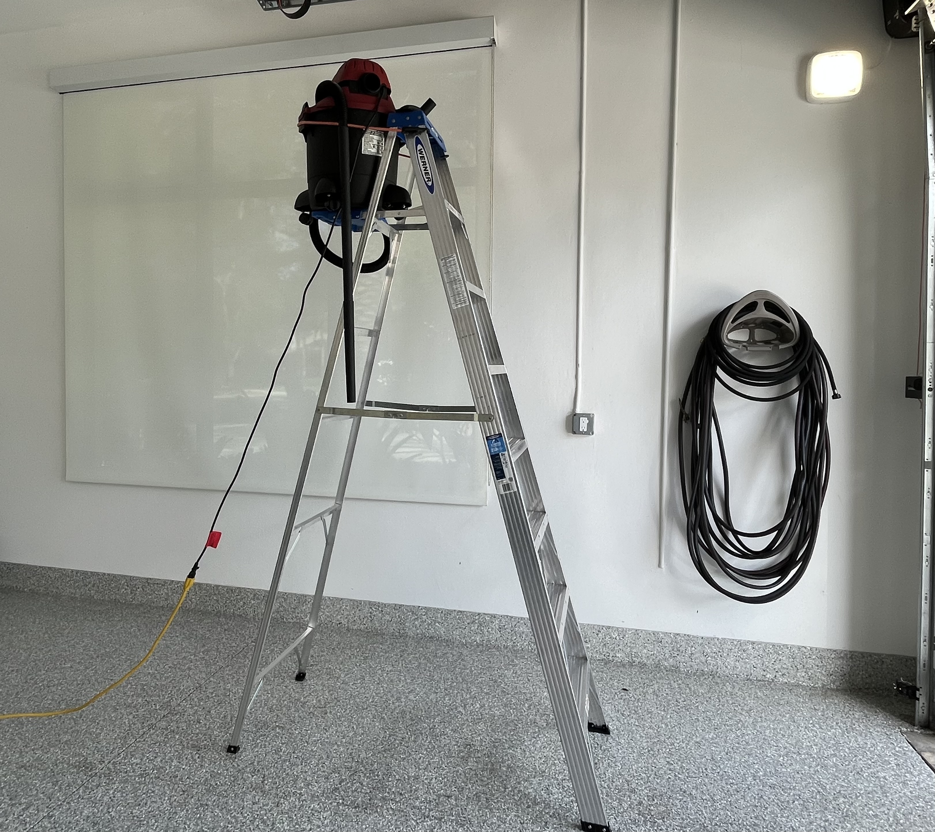 Hand holding the vacuum brush attachment to reach the sealer spider webs on the garage window shade.